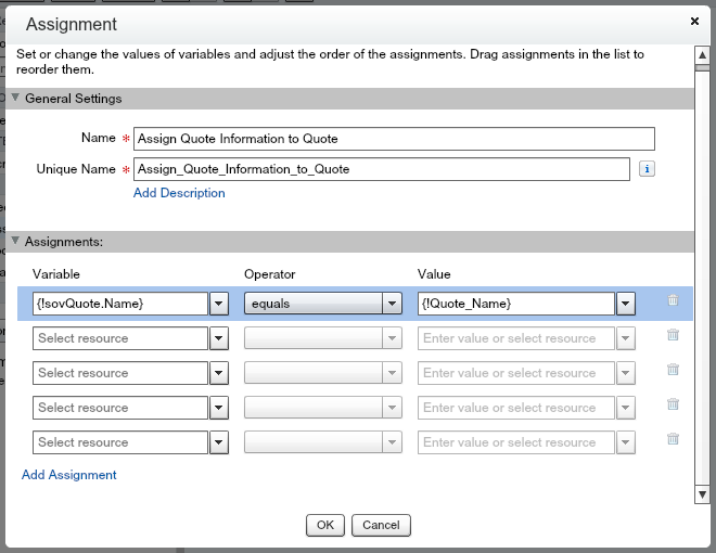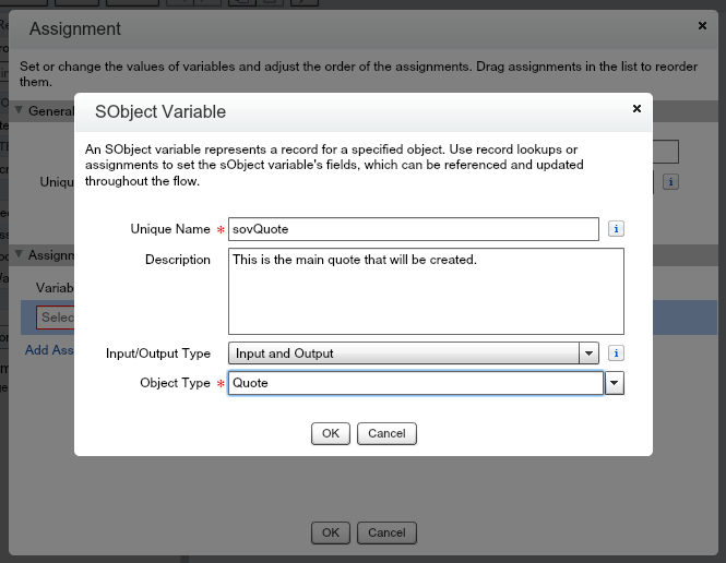 Click OK. After you add a new sObject Variable in the Variable area, it will include the FULL sObject. This is not what you need, so delete the{!sovQuote} and search for sovQuote.Name. Select Name under sObject Variables, then under sovQuote in the Variable input field. For the Operator, select Equals. For Value, click the drop down arrow, then Screen Input Fields, then Quote_Name. You need to add the other two input fields from the Screen and set the Status to Draft. You’ll also need to tie the Quote to the Opportunity (every quote needs to be tied to an Opportunity, standard Salesforce requirement), so click Add Assignment below the Variable input field 4 times.