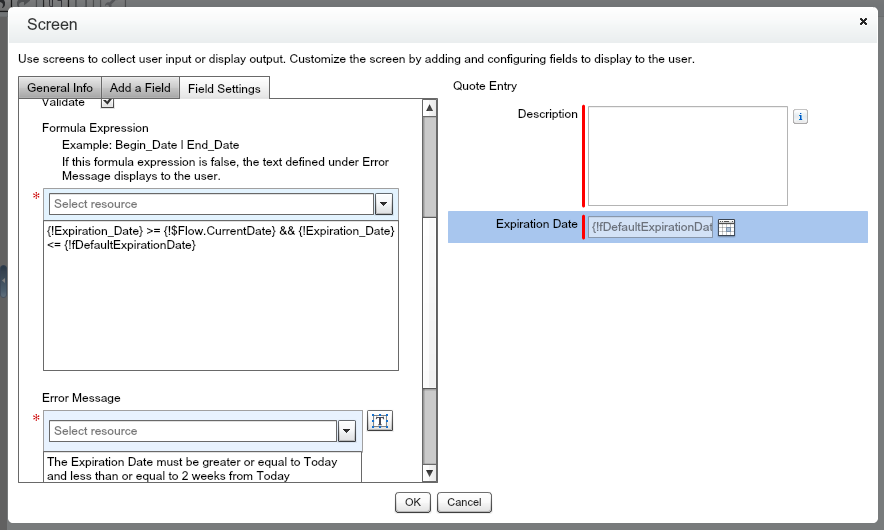 For the formula, you need to use the Unique Name from the Date field. If you start typing Expiration_Date, you’ll notice that it doesn’t come up. This is (I think) a bug from Salesforce. To get around this, uncheck Validate, then click OK to close the Screen. Now double click on the Screen element in the Canvas. Once the Screen element is open again, click on Expiration Date to go back to that field. Now click on Validate and start typing Expiration_Date in the Select resource area. You should see fDefaultExpirationDate and Expiration_Date. Select the Expiration_Date under Screen Input Fields. After {!Expiration_Date}, you want to make sure the Expiration Date is greater or equal to today ({!$Flow.CurrentDate} for Flows!) and Expiration Date is less than or equal to {!fDefaultExpirationDate}. The formula should be “{!Expiration_Date} >= {!$Flow.CurrentDate} && {!Expiration_Date} <= {!fDefaultExpirationDate}”. For the error message, you’ll want to let the User know that “The Expiration Date must be greater or equal to Today and less than or equal to 2 weeks from Today”.