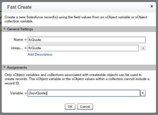Click OK. The vOId variable should auto-fill in. That should take care of the Assignment. Click OK and click Save to make sure your hard work is saved! Don’t worry about the warnings, you’ll get to that at the end. The last element you’ll from the Palette in this post is the Fast Create element. (found in the Data section of the Palette) Drag that and drop it to the right of the Assignment element. Name it fcQuote for Fast Create Quote. Select the sovQuote Variable in the Variable lookup section.