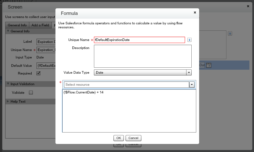Click OK and return to the Screen edit screen. Click on Add a Field and drag over the Date Input. Click on [Date] and enter Expiration Date as the label. Mark this as a Required field. The business rules also say that the Expiration Date should be 2 weeks or less from the day the quote was created until the quote creation date. To help Users out, you want to set the Default Value to Today +14 days (two weeks). To do this, click the drop down arrow on the Default Value input field. Click Create New, then Formula. Enter the Unique Name as “fDefaultExpirationDate”. The f stands for formula and is helpful in the future when you need to reference variables from one Flow to another, so keeping the Unique Names tied to their elements is important for clean app building! You’ll get two more examples later on in this post. Select the Value Data Type as Date. You’ll see an input field with “Select resource” in it. Click the down arrow and select System, then $Flow.CurrentDate. This will give you the… current Date! If you’re familiar with Salesforce formulas, you might be used to TODAY(). This is the Flow way of saying Today. Now, add a plus sign and 14 to complete the formula to look like, “{!$Flow.CurrentDate} + 14”. It should look like the below image.