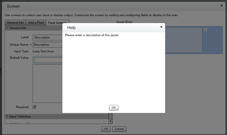 For the Label and Unique Name, enter “Description”. You’ll learn about Default Values later, so for now skip that and check the box Required since this is a requirement for the Quote. If you continue to scroll down past Input Validation (leave the Validate box unchecked), you’ll see Help Text. It’s nice for Users to understand what/why they are entering information, so click the arrow next to Help Text to reveal the Help Text box. You might have seen the Select Resource part of the box in the Long Text Area Default Value place. You’ll review that soon. For now, in the main text area of Help Text, enter, “Please enter a description of this quote.” If you look to the right where [Long Text Area] was, you should now see that it says Description, shows a red line signaling that it is required, and has an information box next to it. Click on the information box (the little box with an i). You should see the below image.