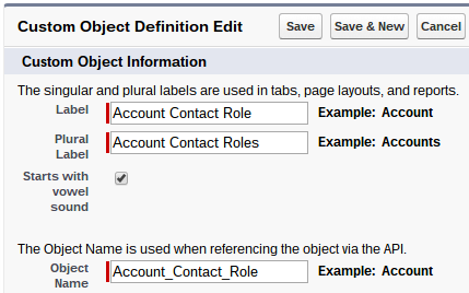 Enter the Label as Account Contact Role and the plural label as Account Contact Roles. Click the box for Starts with a vowel sound. Salesforce should have set the Object Name for you.