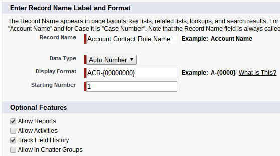 Next, make sure the record nae is Account Contact Role Number, the Data Type is Auto Number, the Display Format is ACR-{00000000}, the Starting Number is 1, Allow Reports is checked, and Track Field History is checked.