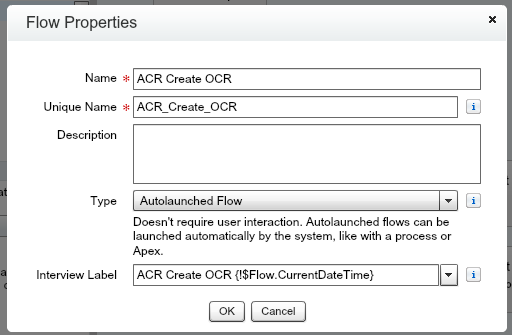 Click on Process Builder. Click New from the right side. Enter the Name as New ACR to Launch ACR Create OCR Flow and the Description as Upon creation of ACR, this will send the ACR Id to the ACR Create OCR Flow.