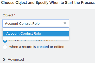 As I told Jay on my initial response, kicking off workflow from the Account Contact Role doesn’t quite work with the Standard Salesforce Account Contact Roles. A Custom Object can be used to kickoff workflow, so, upon his blessing to use a Custom Object, we’ll look at how to accomplish his question using Process Builder to launch the Flow. He also said that: