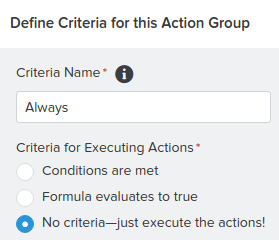 For the Criteria Name enter Always and select the radio button for “No criteria-just execute the actions!”