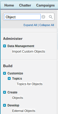 First, a Custom Object needs to be created. Go to Setup and in the Search bar, type Object. Click on Objects under Create.