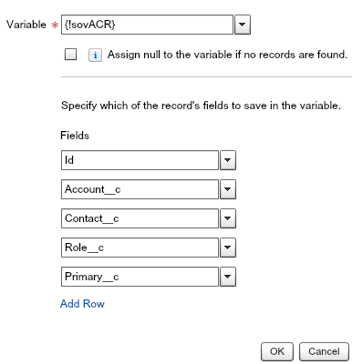 For Variable, click Create New, then sObject Variable. For the Unique Name, enter sovACR (for sObject Variable Account Contact Role), set to Input and Output for the Input/Output Type, the Object Type as Account_Contact_Role__c, and Click OK.