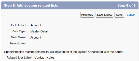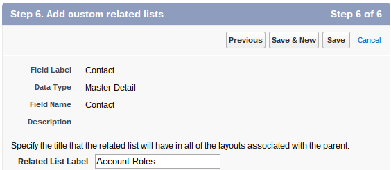 Set the Data Type of this field to be Master-Detail Relationship, the Related To as Account, the Field Label and Field Name to Account, and the Child Relationship Name to be Account_Contact_Roles. Click Next. Click Next. Click Next. On Step 6, Change the Related List Label to be Contact Roles.