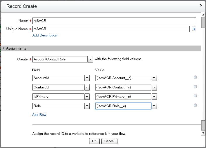 Connect the lOpps Loop Element to the fcOCR Fast Create Element. Congrats, that will create the Opportunity Contact Roles for each of the Opportunities tied to the Account that the Account Contact Role was created from! One last thing. Since a Custom Object was used, it makes sense to still add the standard Account Contact Role, just in case there is a need for it. Drag a Record Create Element and drop it below the Opportunities Decision Element and to the left of the fcOCR Fast Create. Enter the Name and Unique Name as rcSACR (for Record Create Standard Account Contact Role). For Create enter AccountContactRole. For Field enter AccountId and Value as {!sovACR.Account__c}. Click Add Row. Enter ContactId for Field and {!sovACR.Contact__c} for the Value. Click Add Row. Select IsPrimary for the Field and {!sovACR.Primary__c} as the Value. Click Add Row. Select Role for the Field and {!sovACR.Role__c} for the Value.