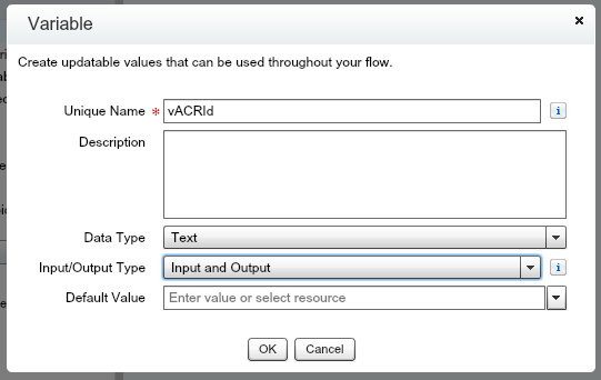 Now, it’s time to build your Flow! Go to Setup, Flows, New Flow. First, you’re going to create a variable to send into the Flow, the Account_Custom_Role Id. Go to Resources, then Variable and double click it. For the Unique Name, enter vACRId (for Variable Account Contact Role Id), the Input/Output Type to Input and Output, and click OK.